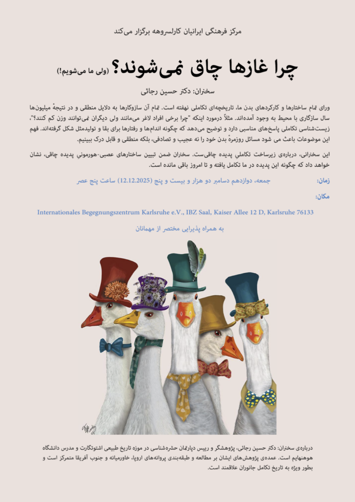 Eine evolutionsbiologische Betrachtung des Phänomens Übergewicht mit Dr. Hossein Rajaei. In diesem Vortrag werfen wir einen präzisen und zugleich spannenden Blick auf die biologischen und evolutionären Mechanismen, die erklären, warum manche Tiere – wie Gänse- nie an Übergewicht leiden, während wir Menschen damit oft zu kämpfen haben.